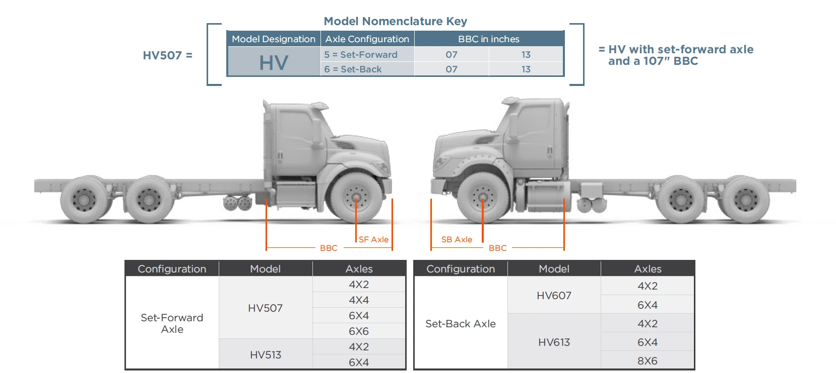 The International HV Series is the newest line of heavy duty vocational trucks that replaced the PayStar/5000 Series and WorkStar/7000 Series, starting in 2018. The trucks are available in configurations from 4x2 up to 8x6, with body to back of cab lengths (BBC) of 107" or 113".